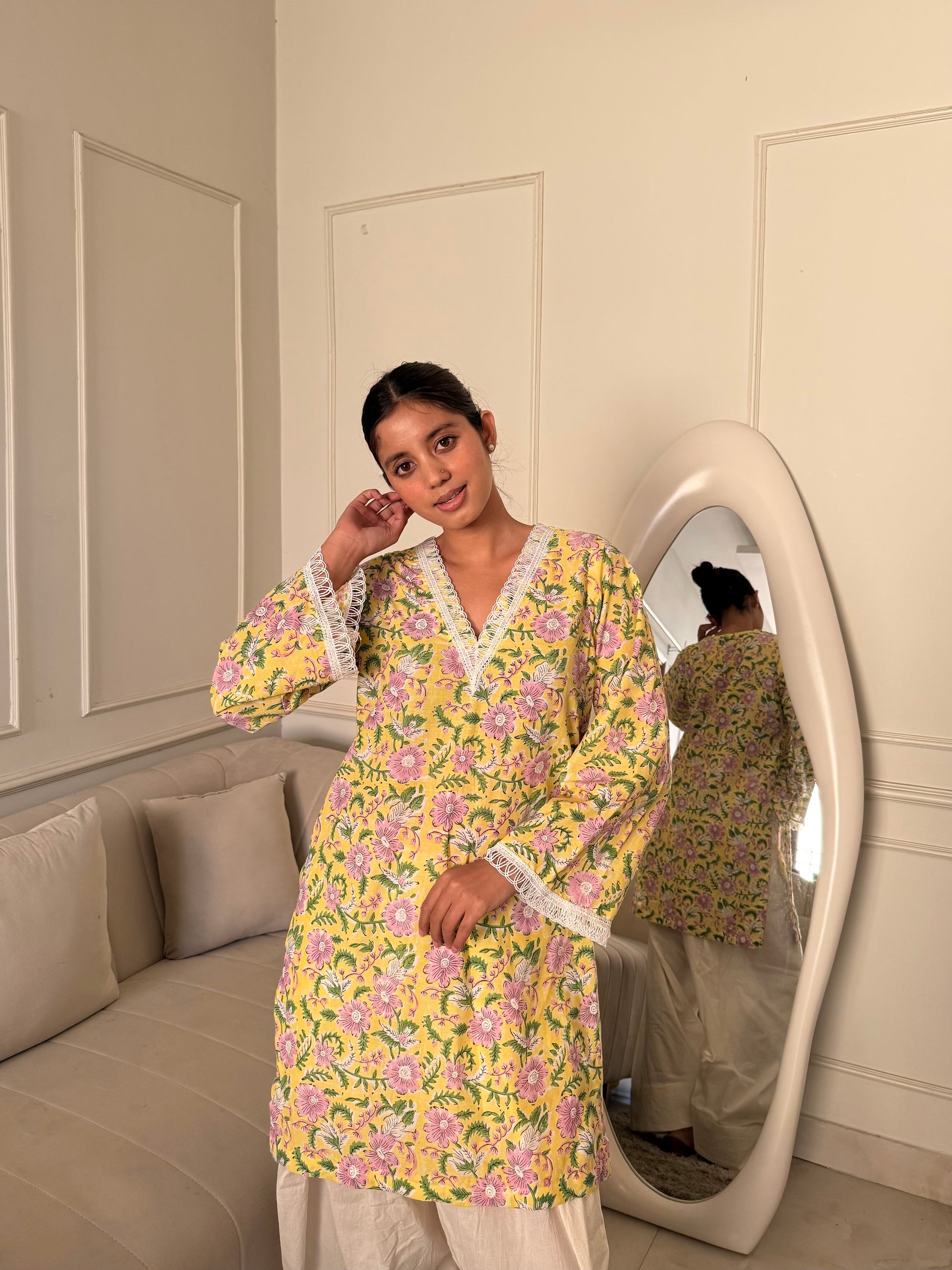 This Farshi Salwar set features a cotton printed loose kurta paired with a traditional farshi salwar, combining comfort with elegant style. The breathable cotton fabric ensures all-day ease, while the loose fit of the kurta allows for graceful movement. Ideal for festive occasions or casual wear, this ensemble offers a timeless silhouette that blends classic design with modern comfort.