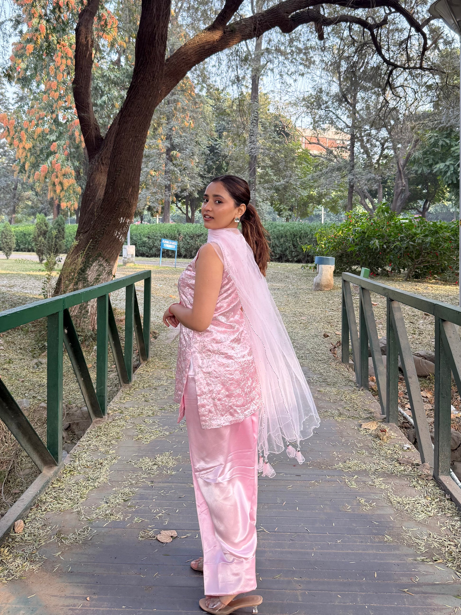 A soft and elegant Farshi Salwar set with subtle detailing and a graceful fall. Perfect for pujas, daytime celebrations, and family gatherings.